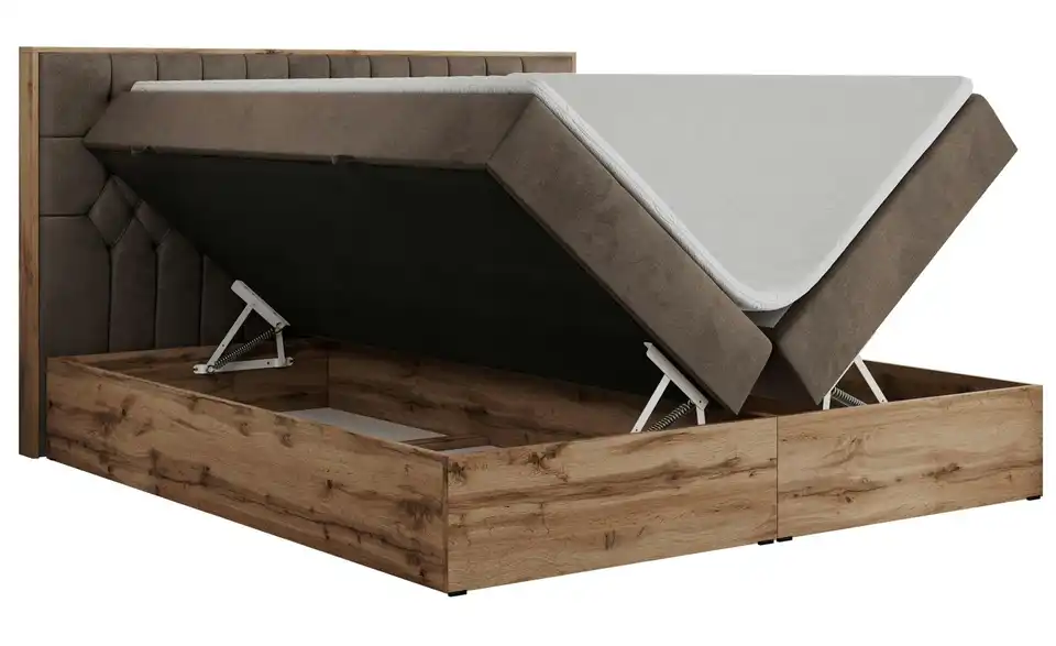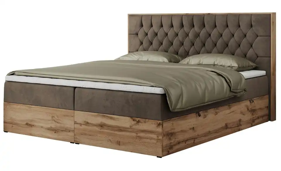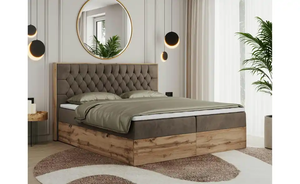 - Lieferumfang / mitgeliefertes ZubehörBronzefarbenes Polsterbett mit Bettkasten 200x200 cm