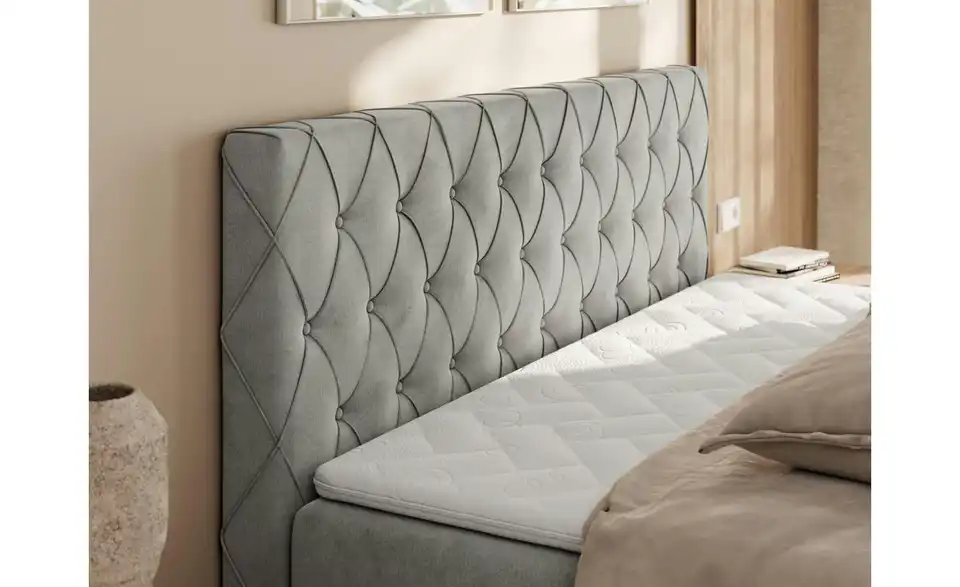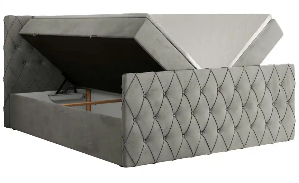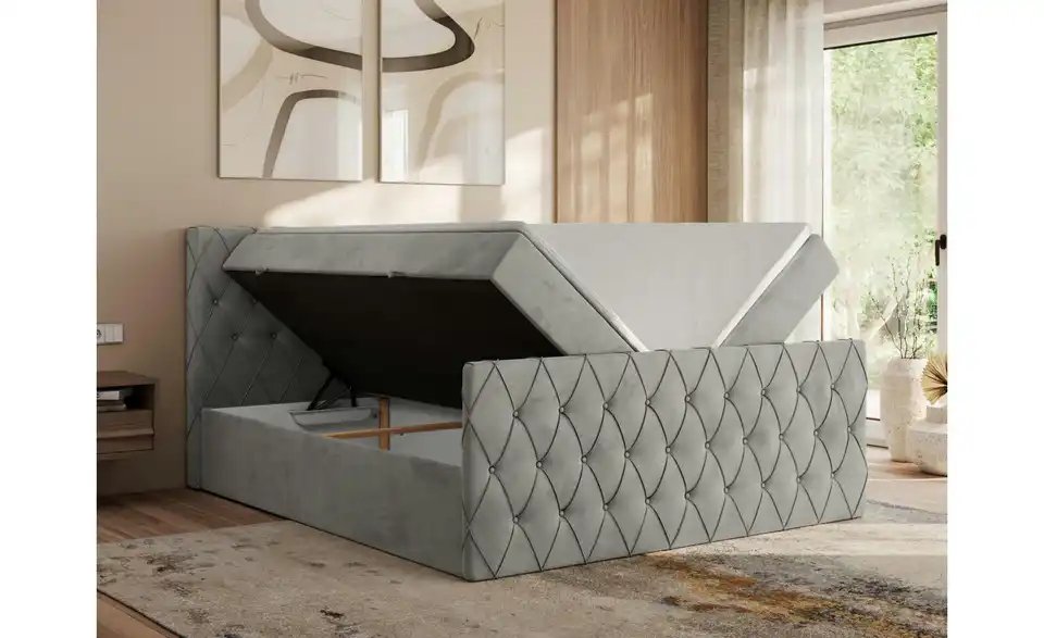 - Lieferumfang / mitgeliefertes ZubehörSilbergraues Polsterbett mit Bettkasten 140x200 cm