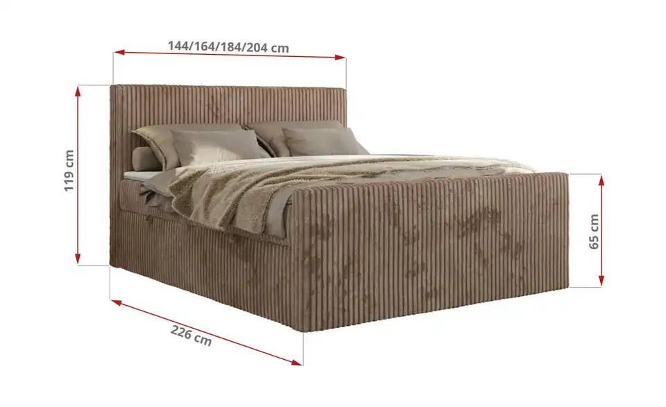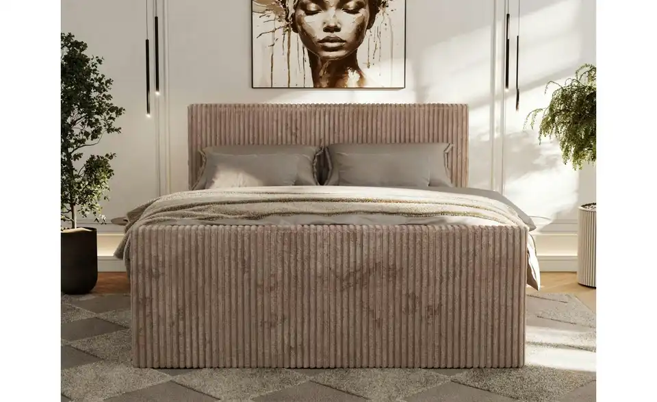 - Lieferumfang / mitgeliefertes ZubehörTaupefarbenes Polsterbett mit Bettkasten 160x200 cm