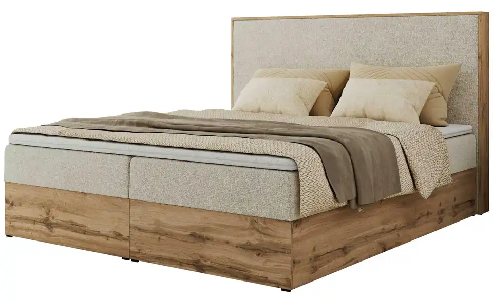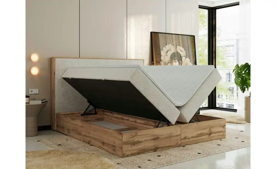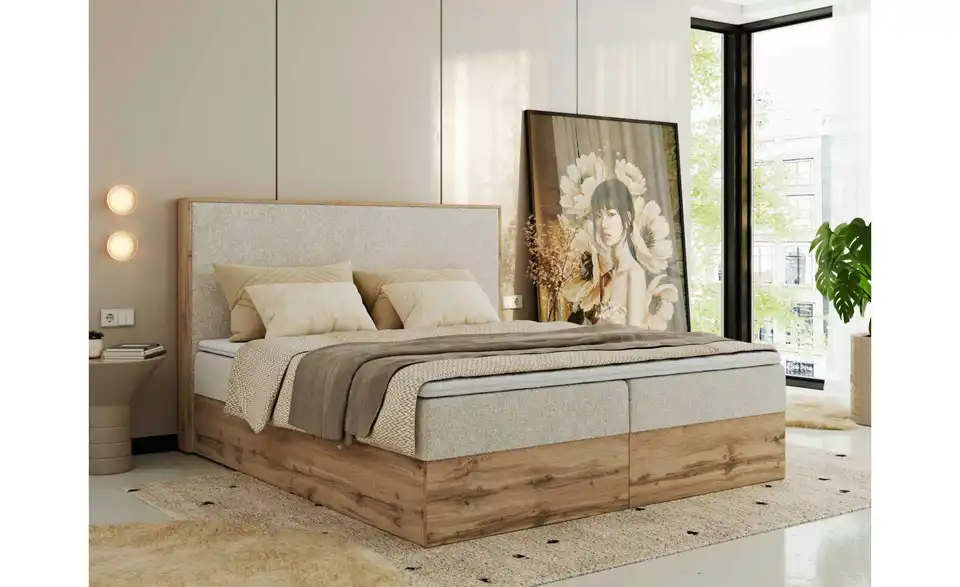 - Lieferumfang / mitgeliefertes ZubehörHellbeiges Polsterbett mit Bettkasten 160x200 cm