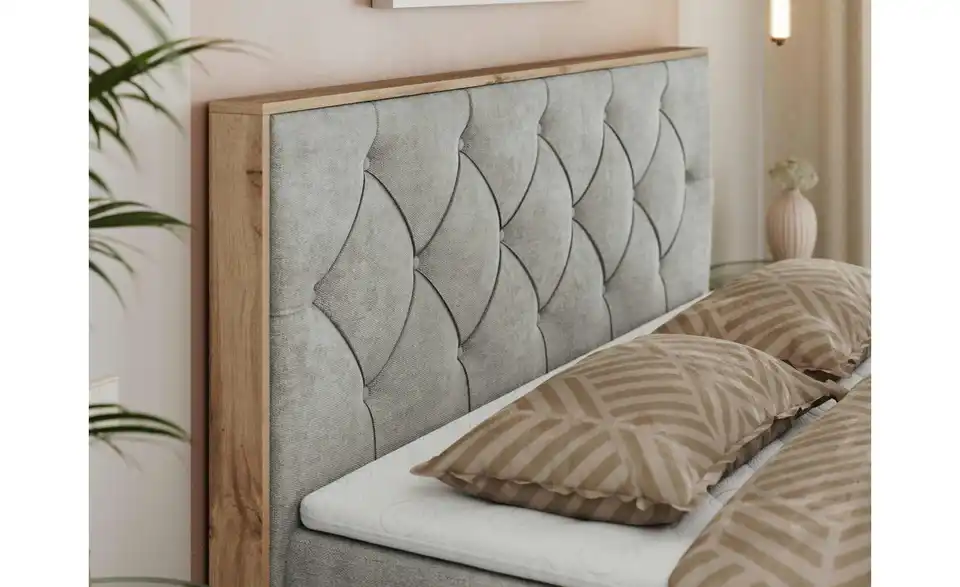 - Lieferumfang / mitgeliefertes ZubehörHellgraues Polsterbett mit Bettkasten 140x200 cm