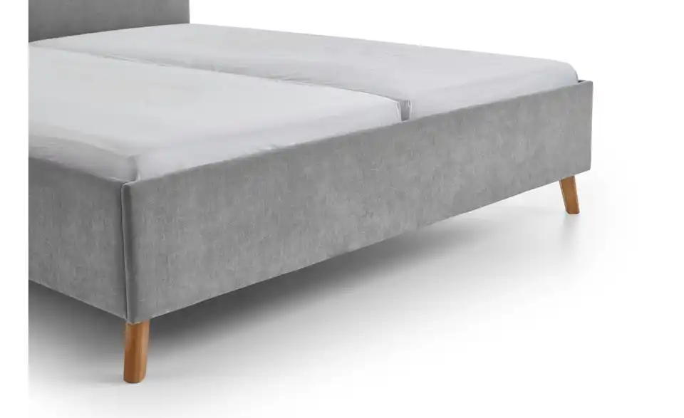 - Lieferumfang / mitgeliefertes ZubehörGraues Polsterbett 180x200 cm mit Holzfüßen, eichefarbig