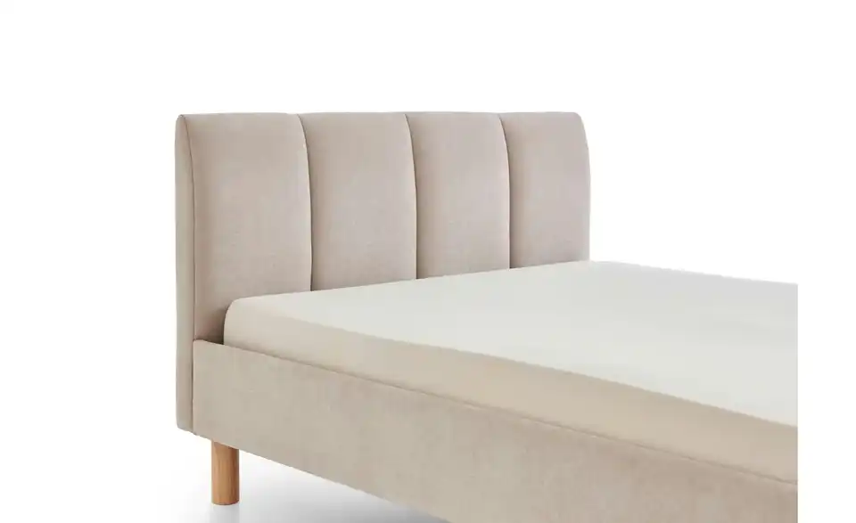- Lieferumfang / mitgeliefertes ZubehörBeiges Polsterbett 120x200 cm mit Holzfüßen, eichefarbig