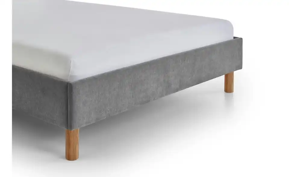 - Lieferumfang / mitgeliefertes ZubehörGraues Polsterbett 120x200 cm mit Holzfüßen, eichefarbig