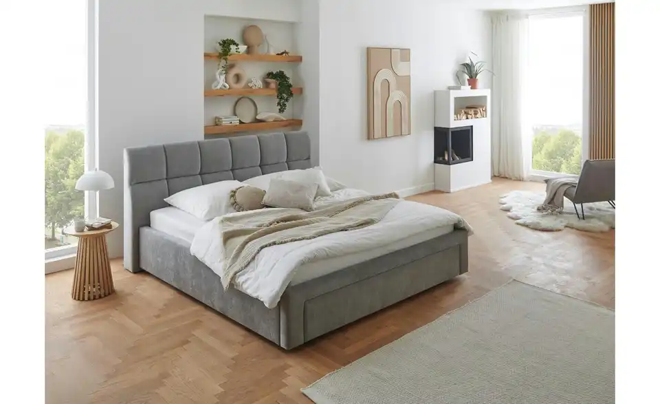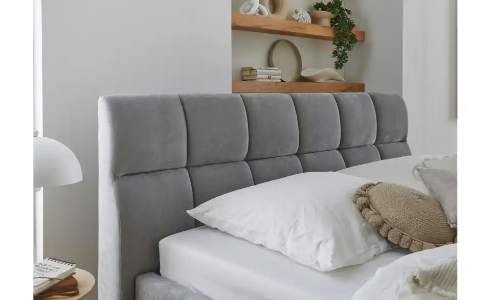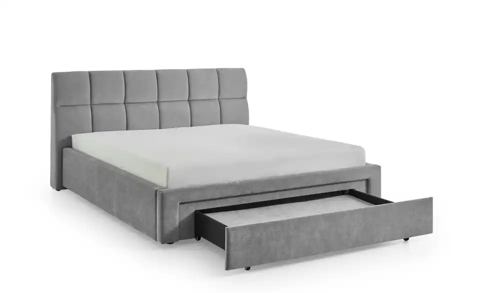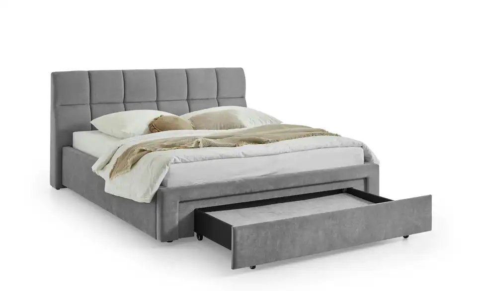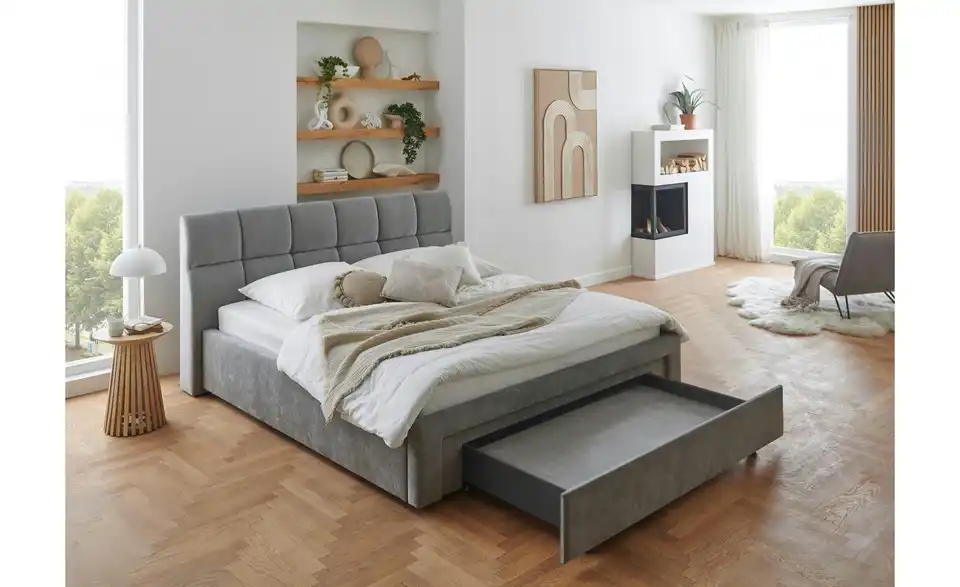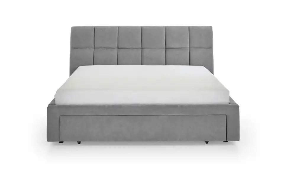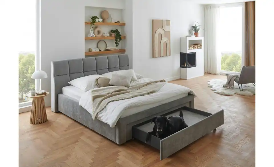 - Lieferumfang / mitgeliefertes ZubehörGraues Polsterbett 180x200 cm mit Schubkasten inkl. Kissen für Hundebett