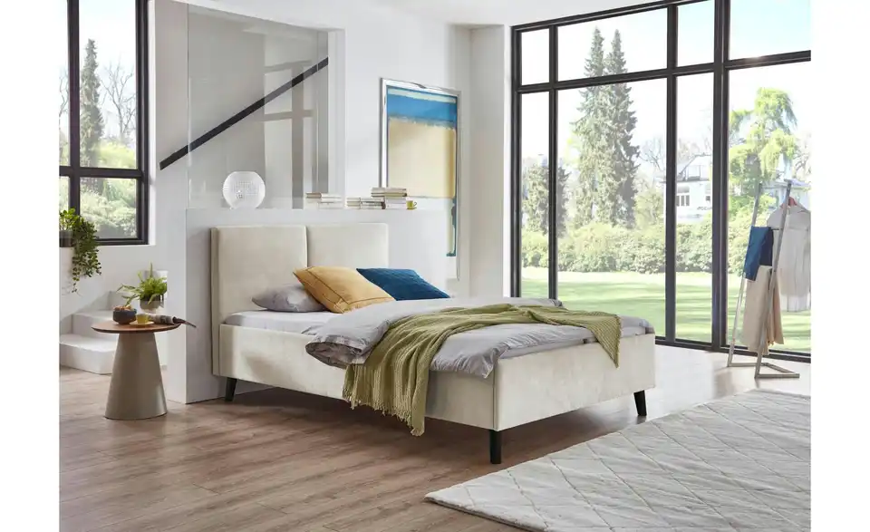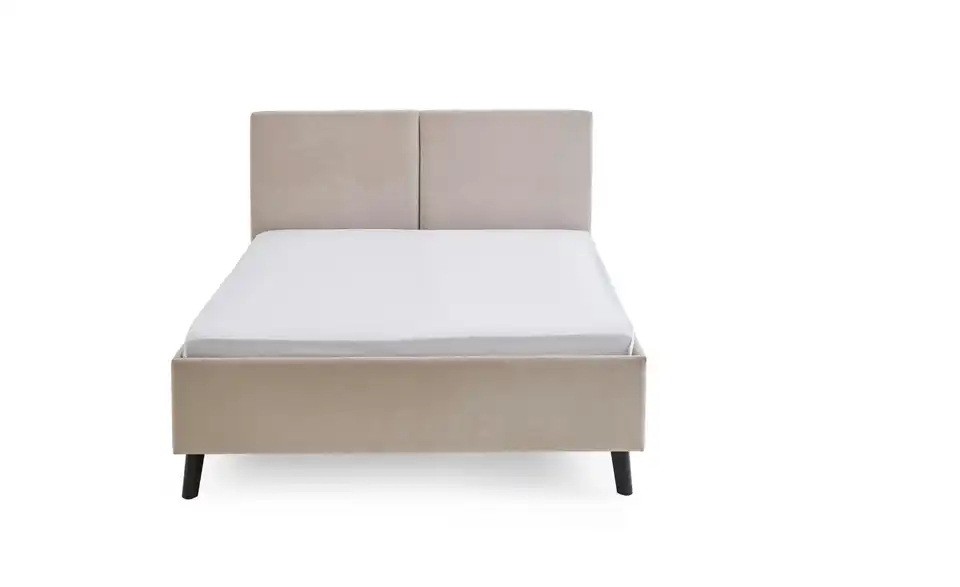 - Lieferumfang / mitgeliefertes ZubehörBeiges Polsterbett 140x200 cm mit Holzfüßen, schwarz
