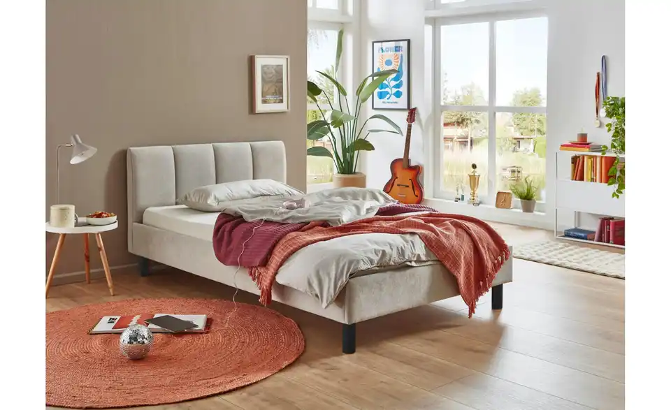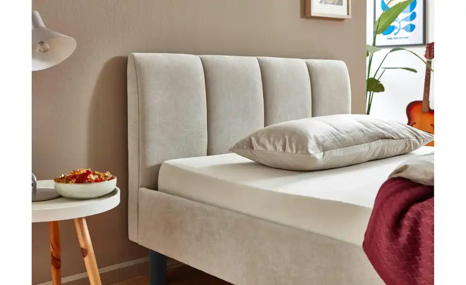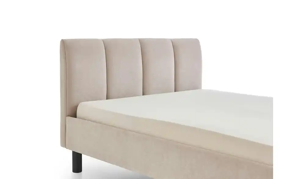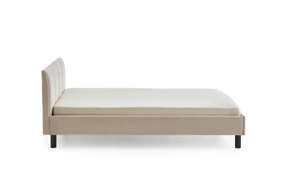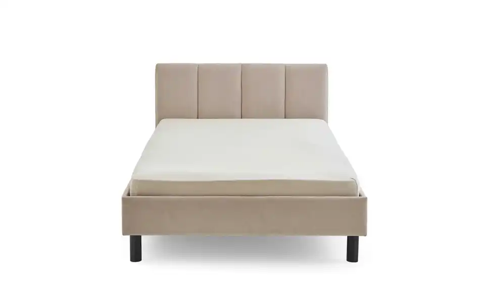 - Lieferumfang / mitgeliefertes ZubehörBeiges Polsterbett 120x200 cm mit Holzfüßen, schwarz