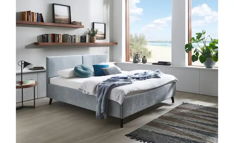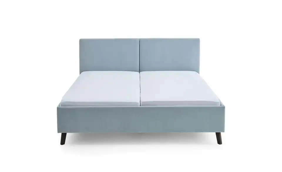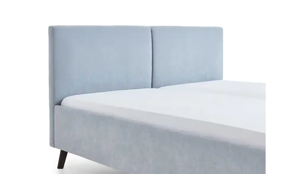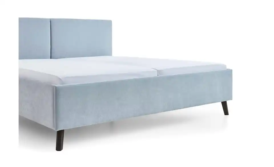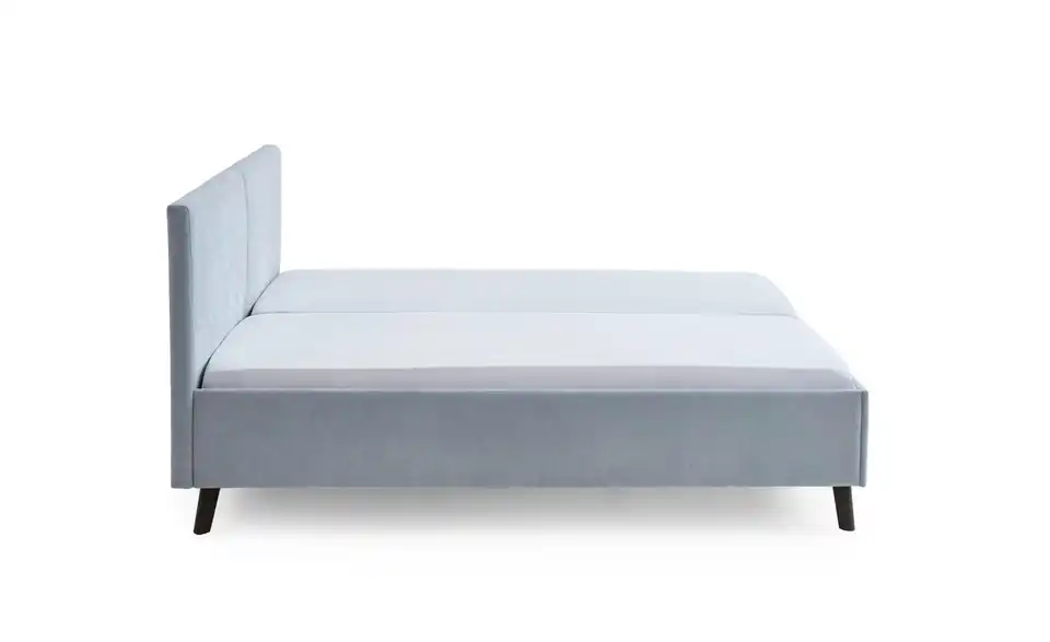 - Lieferumfang / mitgeliefertes ZubehörHellblaues Polsterbett 160x200 cm mit Holzfüßen, schwarz