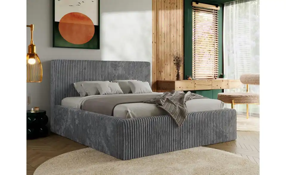 - Lieferumfang / mitgeliefertes ZubehörGraues Polsterbett mit Bettkasten 200x200 cm
