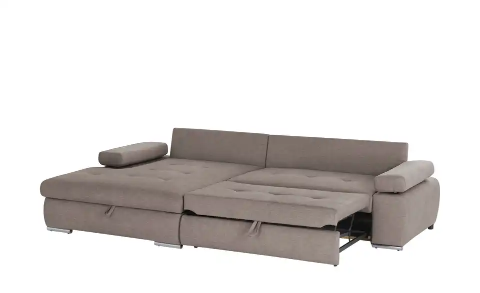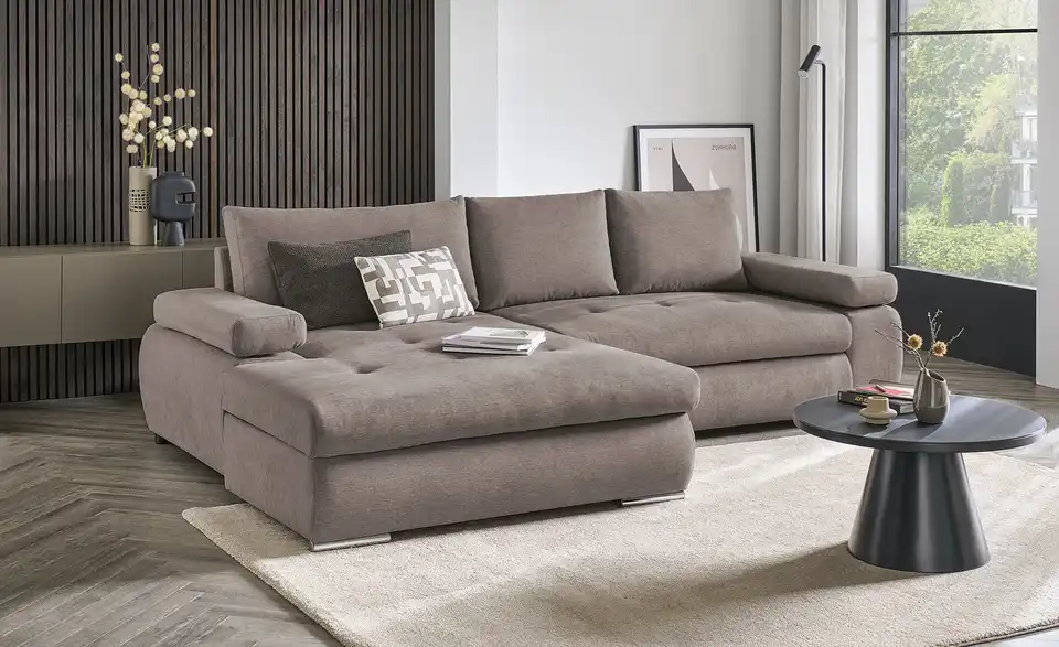 Das Ecksofa Ibby mit seiner weitläufigen L-Form bietet viel Platz zum Entspannen und Erholen. Die Sitzfläche ist mit einer Wellenunterfederung ausgestattet. Darauf befindet sich eine Polsterung aus Schaumstoff, die sich auch im Rückenbereich und den Armlehnen wiederfindet. Somit ist ein angenehmes Sitzen und Liegen gewährleistet. Für noch mehr Komfort sind drei Rückenkissen im Lieferumfang enthalten. Die Armlehnen lassen sich individuell verstellen. Ein weiteres Highlight von Ibby ist die Schlaffunktion: Ziehen Sie Ibby einfach zum Gästebett aus. Im großzügigen Bettkasten unter der Sitzfläche können Sie zum Beispiel Bettwäsche für den Besuch verstauen. Ibby ist rundum mit einem einfarbigen Stoff bezogen. So können Sie Ibby auch frei in den Wohnraum stellen. Wählen Sie aus verschiedenen strapazierfähigen Stoffbezügen und bestimmen Sie die Gestaltung Ihres Sofas ganz einfach selbst.Lieferung & Versand