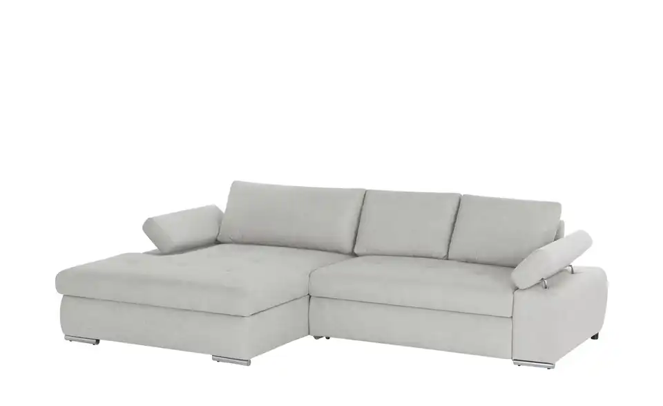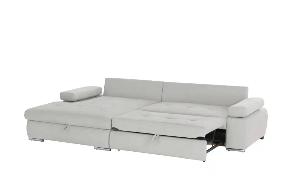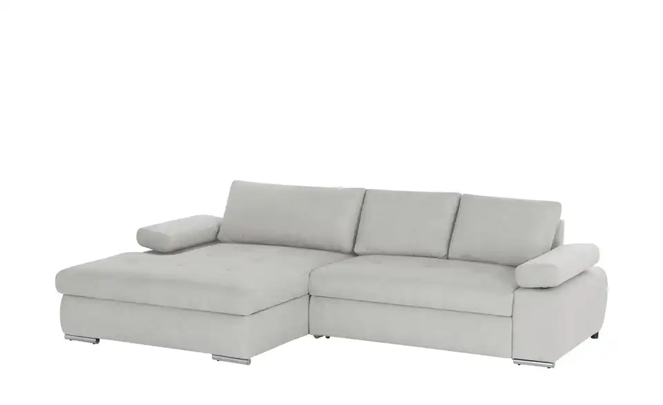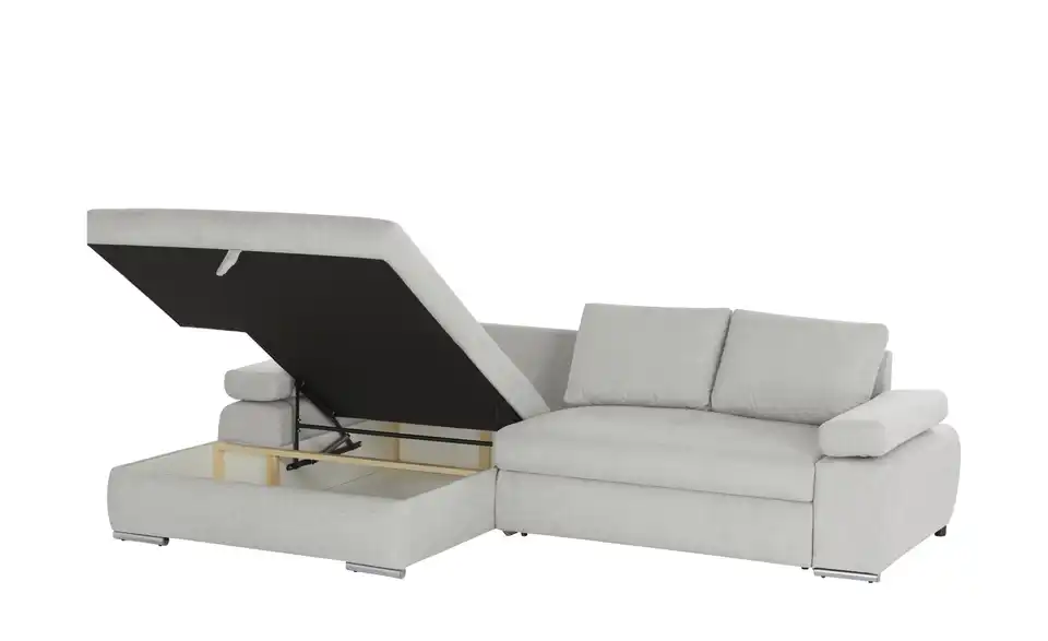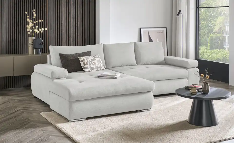 Das Ecksofa Ibby mit seiner weitläufigen L-Form bietet viel Platz zum Entspannen und Erholen. Die Sitzfläche ist mit einer Wellenunterfederung ausgestattet. Darauf befindet sich eine Polsterung aus Schaumstoff, die sich auch im Rückenbereich und den Armlehnen wiederfindet. Somit ist ein angenehmes Sitzen und Liegen gewährleistet. Für noch mehr Komfort sind drei Rückenkissen im Lieferumfang enthalten. Die Armlehnen lassen sich individuell verstellen. Ein weiteres Highlight von Ibby ist die Schlaffunktion: Ziehen Sie Ibby einfach zum Gästebett aus. Im großzügigen Bettkasten unter der Sitzfläche können Sie zum Beispiel Bettwäsche für den Besuch verstauen. Ibby ist rundum mit einem einfarbigen Stoff bezogen. So können Sie Ibby auch frei in den Wohnraum stellen. Wählen Sie aus verschiedenen strapazierfähigen Stoffbezügen und bestimmen Sie die Gestaltung Ihres Sofas ganz einfach selbst.Lieferung & Versand