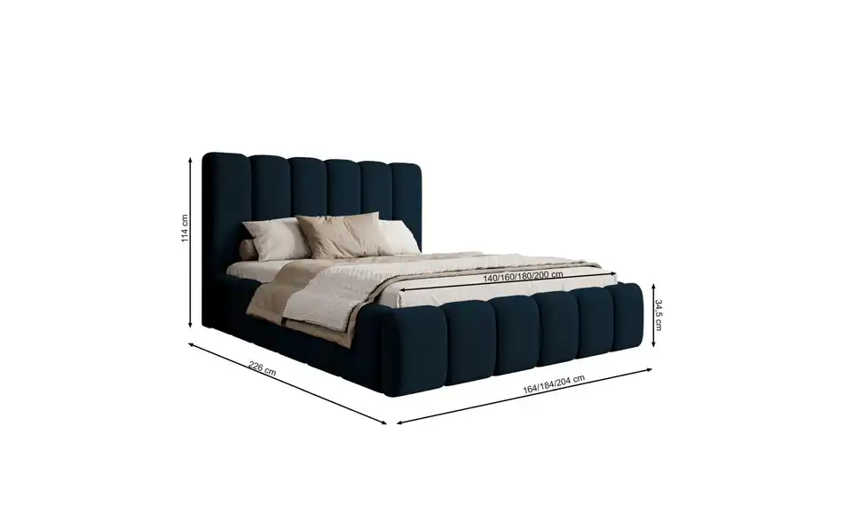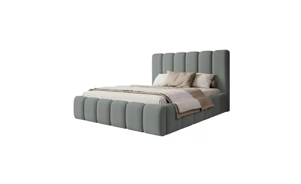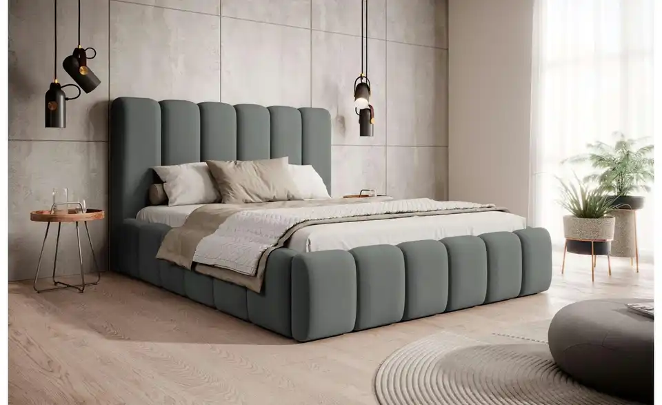 - Lieferumfang / mitgeliefertes ZubehörGraues Polsterbett mit Bettkasten 160x200 cm