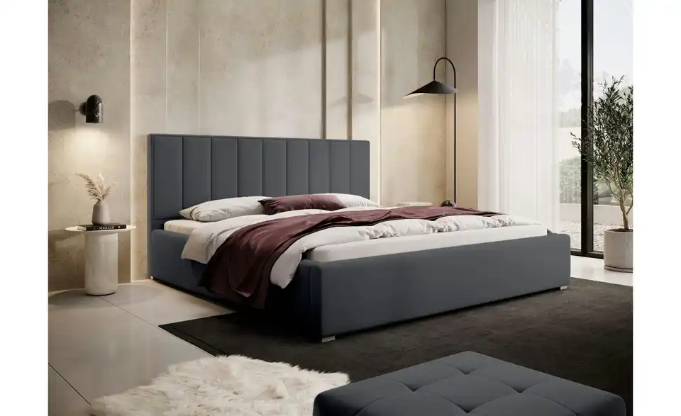 - Lieferumfang / mitgeliefertes ZubehörDunkelgraues Polsterbett mit Bettkasten 200x200 cm
