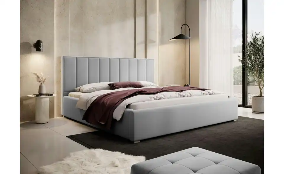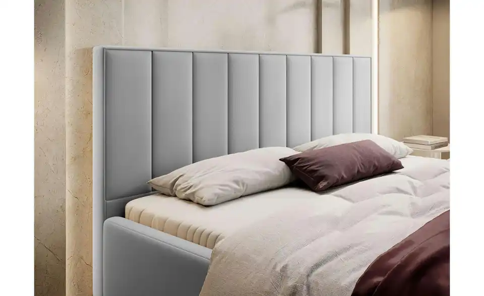 - Lieferumfang / mitgeliefertes ZubehörHellgraues Polsterbett mit Bettkasten 180x200 cm