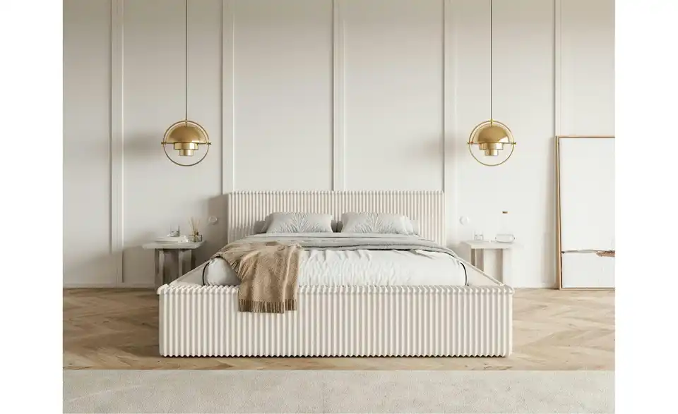 - Lieferumfang / mitgeliefertes ZubehörCremefarbenes Polsterbett mit Bettkasten 140x200 cm