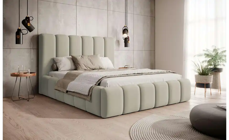 - Lieferumfang / mitgeliefertes ZubehörGreiges Polsterbett mit Bettkasten 180x200 cm