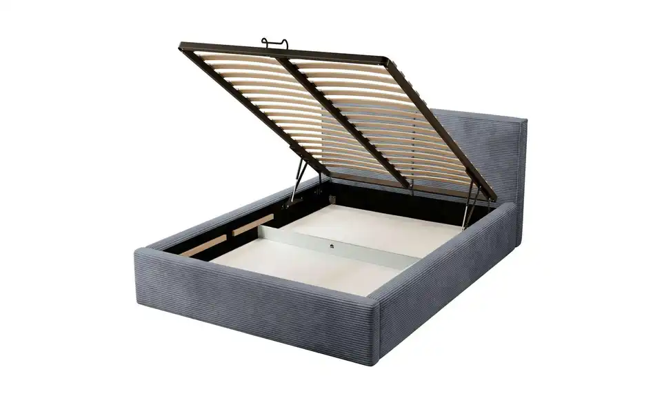 - Lieferumfang / mitgeliefertes ZubehörGraues Polsterbett mit Bettkasten 140x200 cm