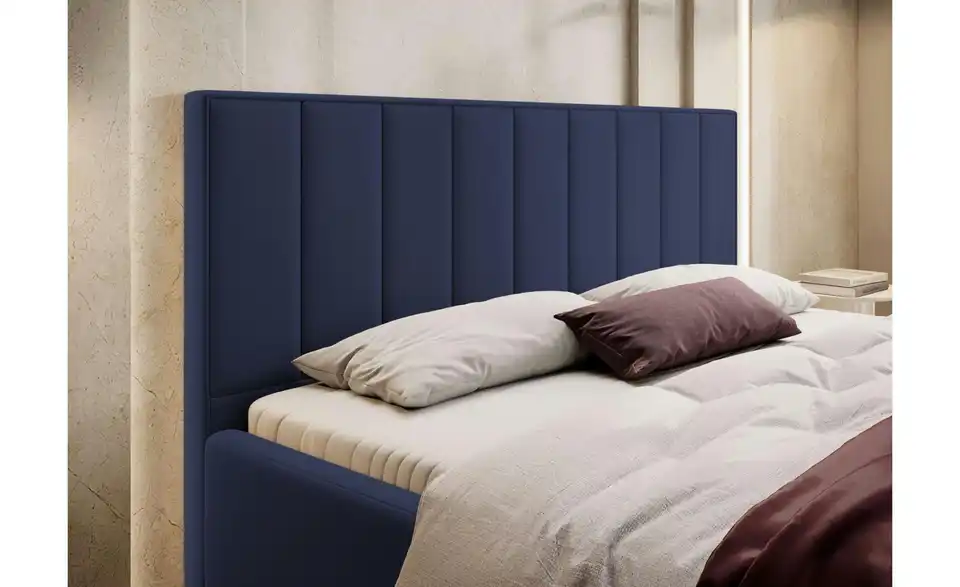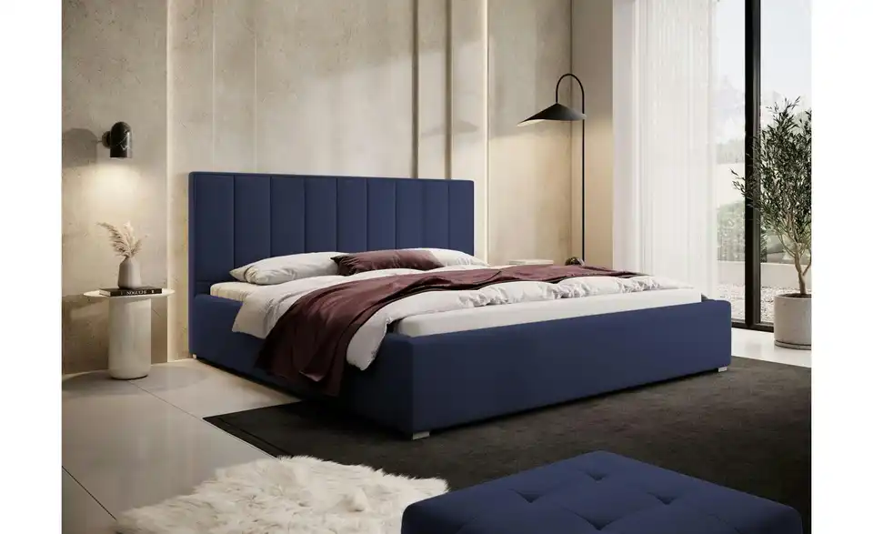 - Lieferumfang / mitgeliefertes ZubehörBlaues Polsterbett mit Bettkasten 200x200 cm