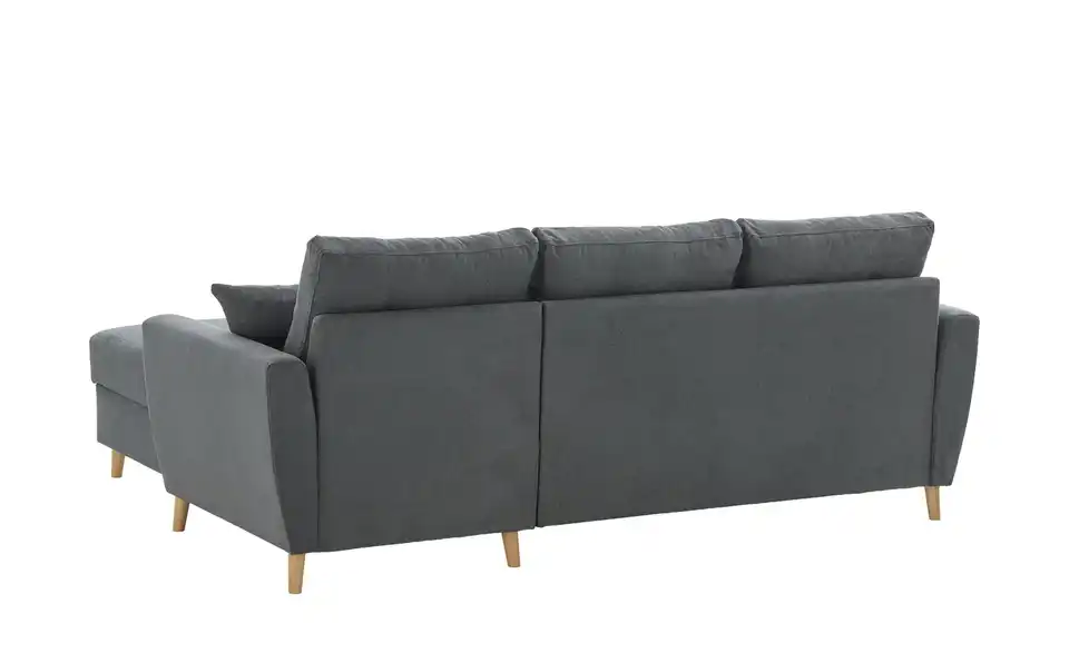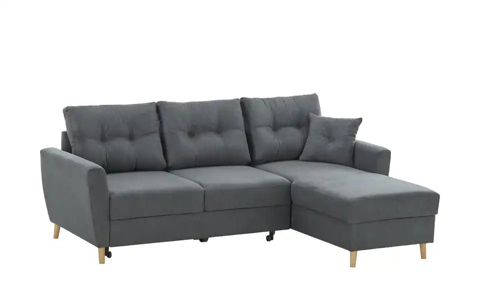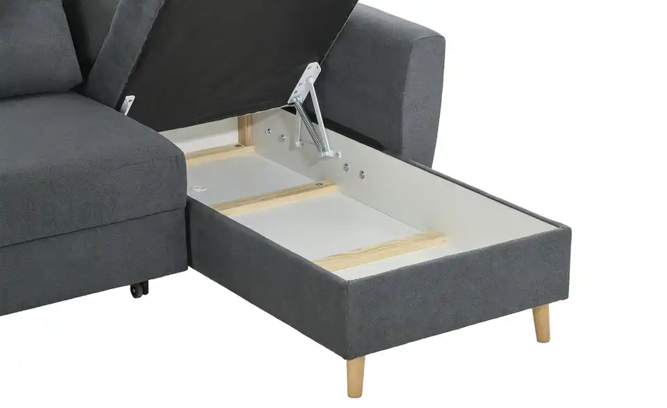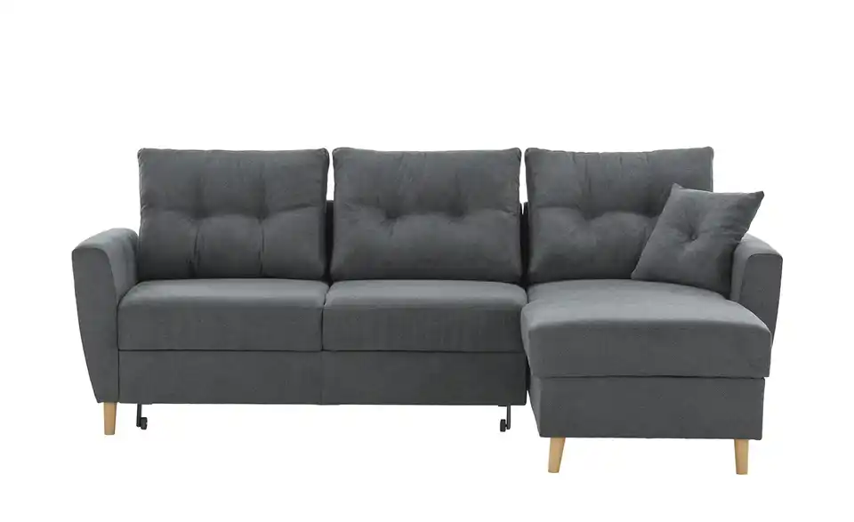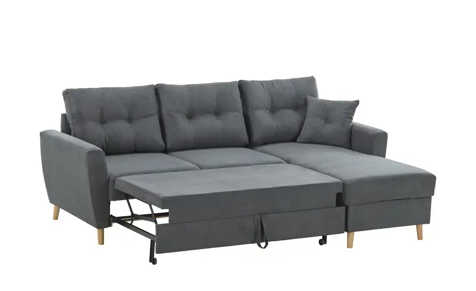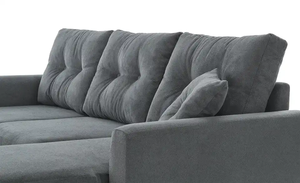 Platz nehmen, zurücklehnen und genießen: Das Ecksofa Carla sorgt für zusätzliche Gemütlichkeit. Die Couch kann dank des echt bespannten Rückens frei im Raum aufgestellt werden und lädt auch aufgrund der bequemen Polsterung aus Schaumstoff zum Relaxen ein. Sie besticht mit ihrem Gestell aus Massivholz. Um Zierkissen brauchen Sie sich keine Gedanken zu machen, denn diese sind bereits im Lieferumfang inbegriffen. Das Modell Carla dient aufgrund des praktischen Bettkastens als Stauraummöbel und nimmt insgesamt 230 x 93 x 159 cm ein. Dieses Sofa überzeugt als komfortable und ästhetische Ergänzung für Ihr Zuhause.Lieferung & Versand