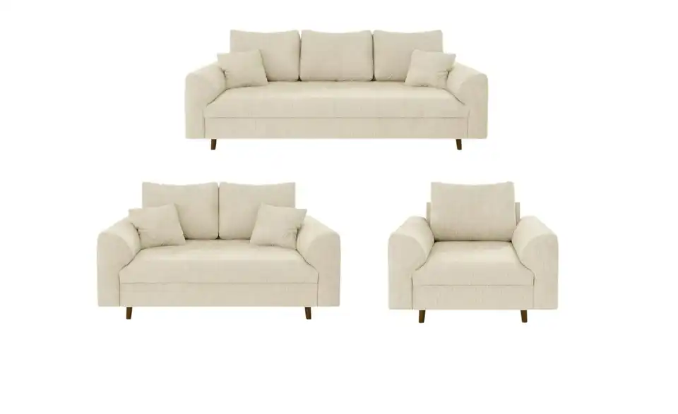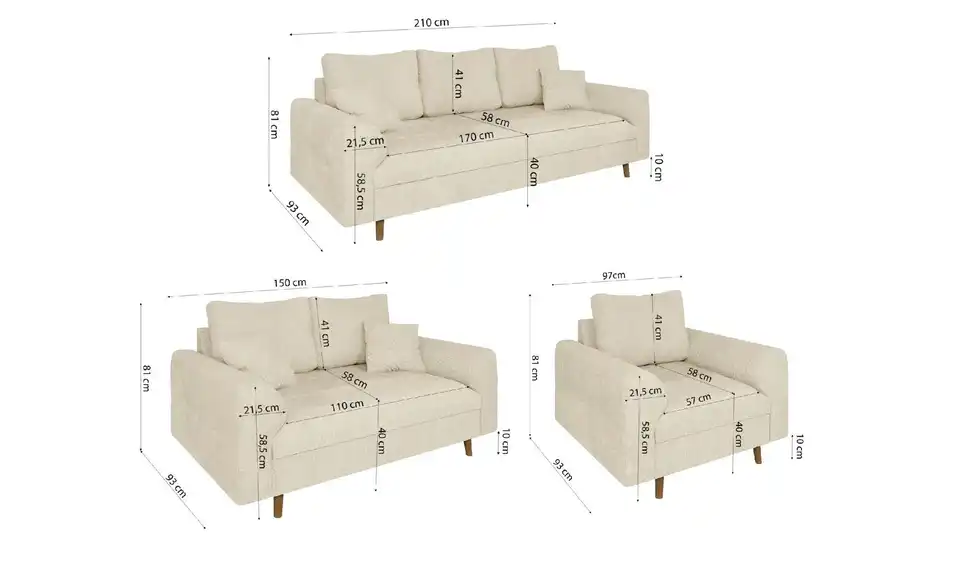 - Lieferumfang / mitgeliefertes Zubehör3-Sitzer Sofa, 2-Sitzer Sofa, Sessel, Montagematerial, 4x Zierkissen