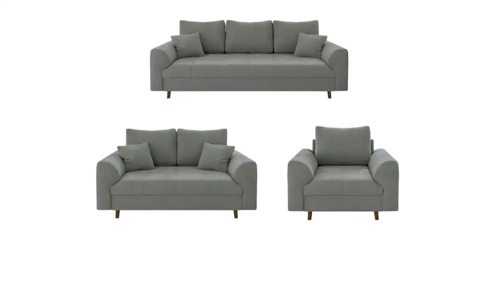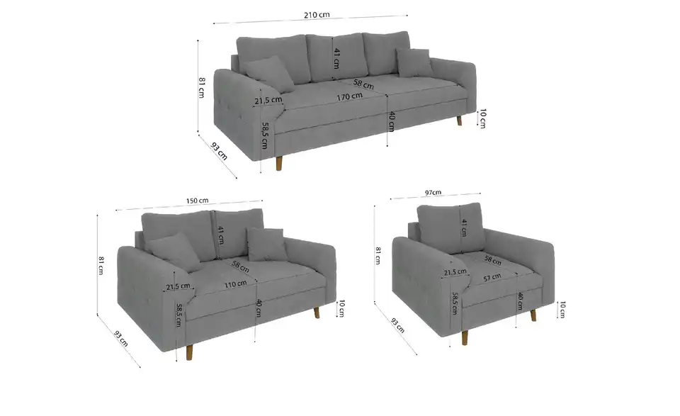 - Lieferumfang / mitgeliefertes Zubehör3-Sitzer Sofa, 2-Sitzer Sofa, Sessel, Montagematerial, 4x Zierkissen