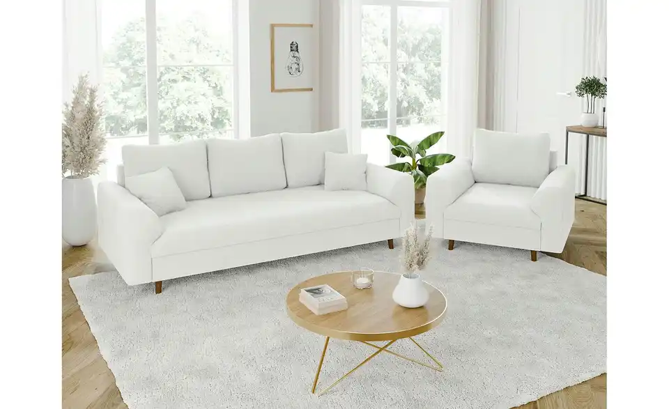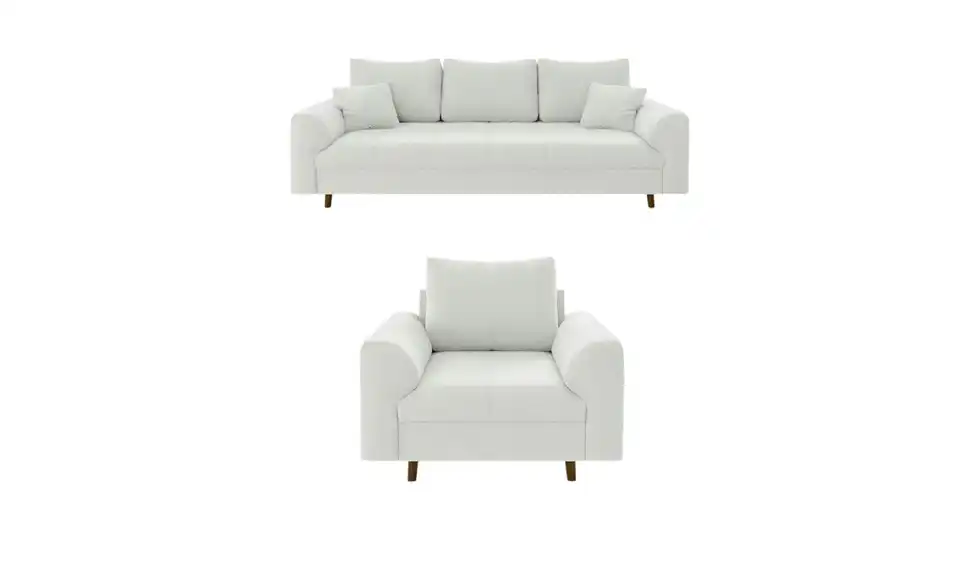 - Lieferumfang / mitgeliefertes Zubehör3-Sitzer Sofa, Sessel, Montagematerial, 2x Zierkissen