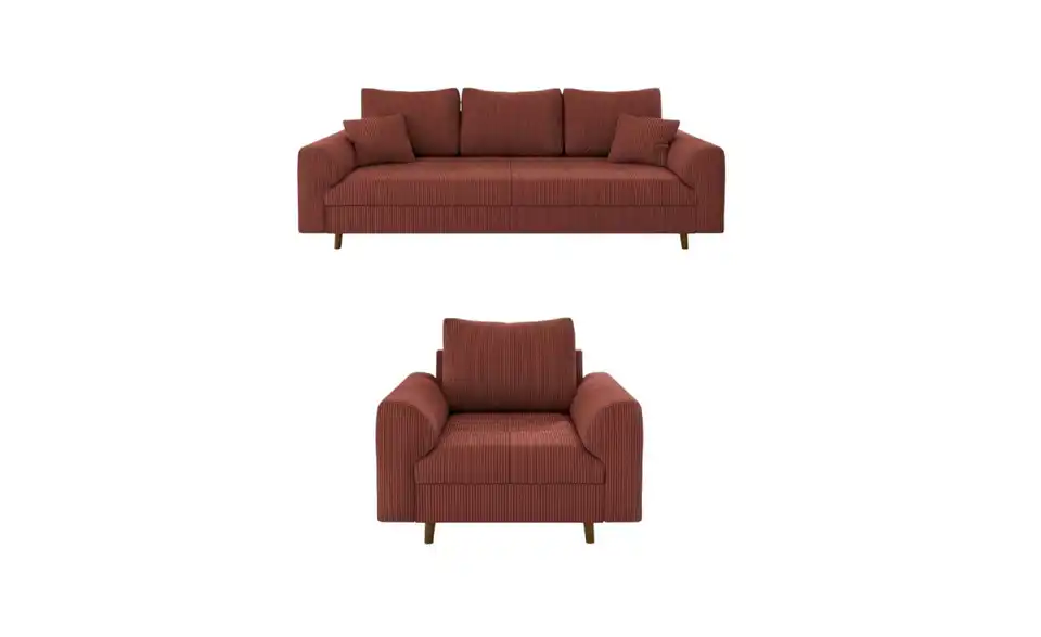 - Lieferumfang / mitgeliefertes Zubehör3-Sitzer Sofa, Sessel, Montagematerial, 2x Zierkissen