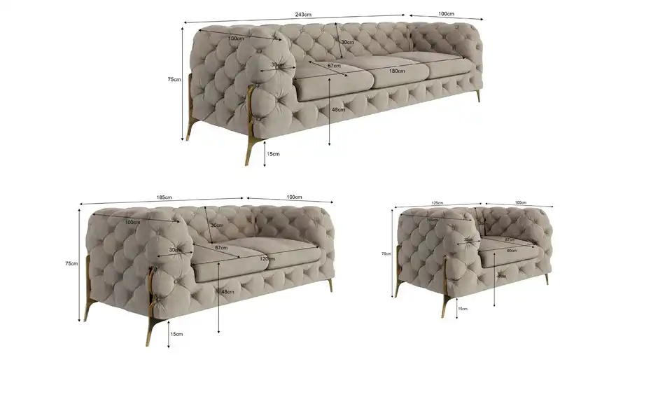 - Lieferumfang / mitgeliefertes Zubehör1 x 3-Sitzer Sofa, 1 x 2-Sitzer Sofa, Sessel, Montagematerial