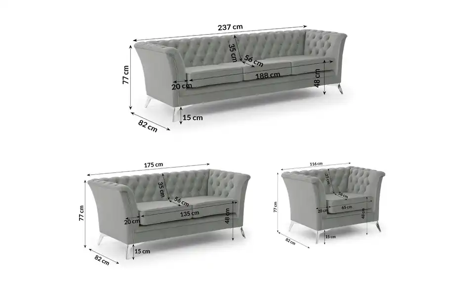- Lieferumfang / mitgeliefertes Zubehör1 x 3-Sitzer Sofa, 1 x 2-Sitzer Sofa, Sessel, Montagematerial