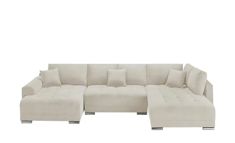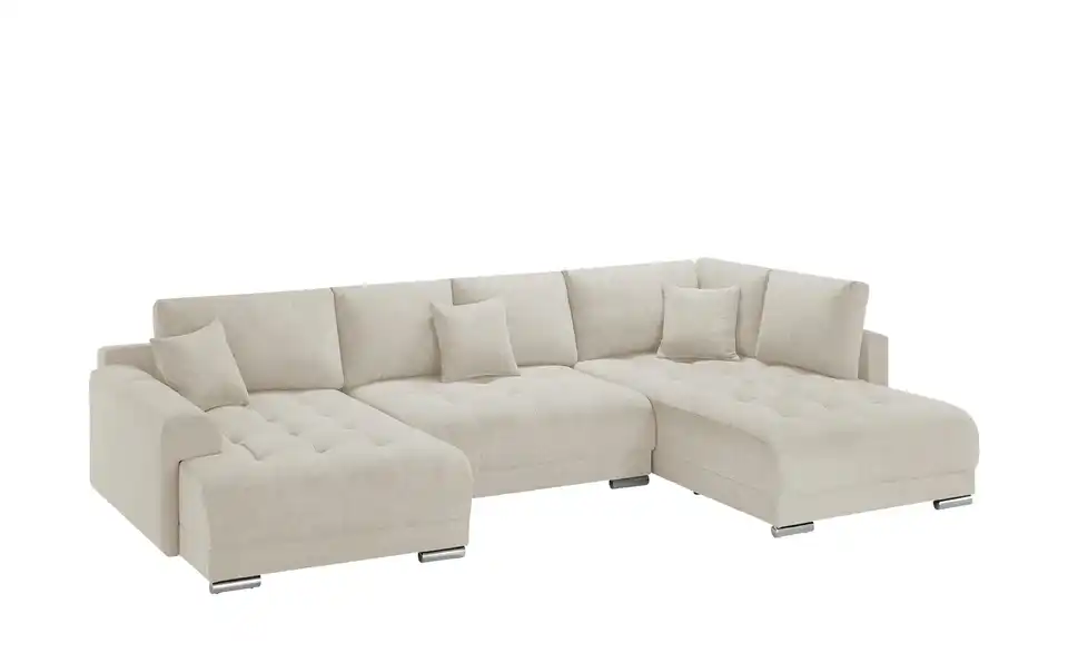 Richtig viel Platz für Freunde und Familie: Diese Wohnlandschaft überzeugt mit zwei einladenden Ottomanen und einer praktischen Schlaffunktion. Sitzen Sie zur Familienfeier bequem zusammen oder genießen Sie in großer Runde einen Filmeabend mit Freunden. Platz gibt es hier genug. Und wenn es doch etwas länger wird, können Sie mit nur wenigen Griffen den Mittelteil umklappen und zu einer Liegefläche umfunktionieren. Dann finden zwei Übernachtungsgäste problemlos Platz. Das dazugehörige Bettzeug lässt sich außerdem im geräumigen Bettkasten unter der Sitzfläche verstauen.Lieferung & Versand
