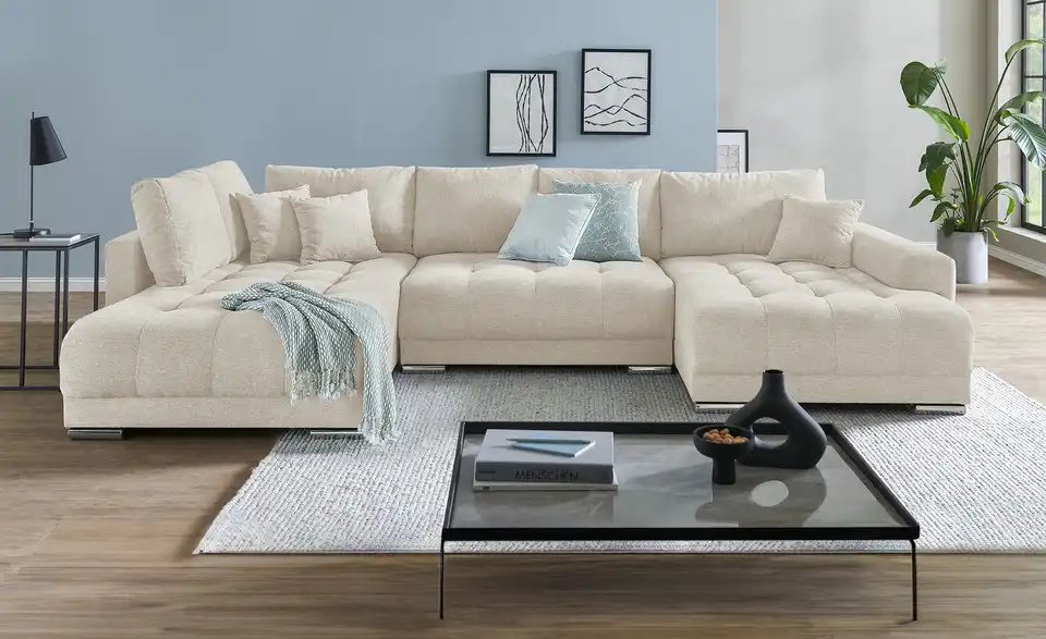 Richtig viel Platz für Freunde und Familie: Diese Wohnlandschaft überzeugt mit zwei einladenden Ottomanen und einer praktischen Schlaffunktion. Sitzen Sie zur Familienfeier bequem zusammen oder genießen Sie in großer Runde einen Filmeabend mit Freunden. Platz gibt es hier genug. Und wenn es doch etwas länger wird, können Sie mit nur wenigen Griffen den Mittelteil umklappen und zu einer Liegefläche umfunktionieren. Dann finden zwei Übernachtungsgäste problemlos Platz. Das dazugehörige Bettzeug lässt sich außerdem im geräumigen Bettkasten unter der Sitzfläche verstauen.Lieferung & Versand