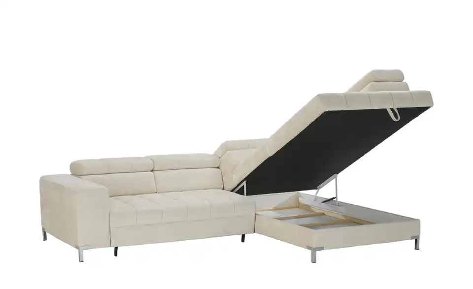 Dieses Ecksofa ist eine großartige Bereicherung für Ihre Einrichtung. Die Couch wird dank der Kopfteilverstellung zu einer absoluten Oase der Entspannung, lädt aufgrund des Federkerns sowie der Polsterung aus Schaumstoff zum Relaxen ein und ist frei im Raum platzierbar. Das Gestell ist aus Metall gefertigt. Die Couch weist einen Bettkasten, in dem die Gästebettwäsche verstaut werden kann, auf, nimmt 284 x 97 x 200 cm ein und lädt mit der geräumigen Sitztiefe von 62 cm zum Relaxen ein. Dieses Sofa garantiert jedem Zuhause außergewöhnliche Wohlfühlmomente.