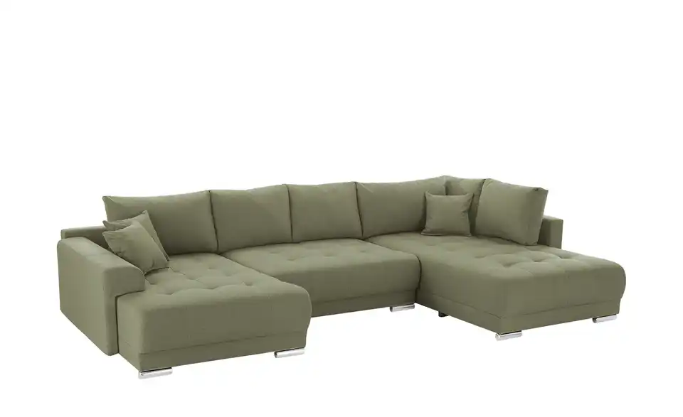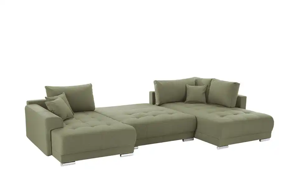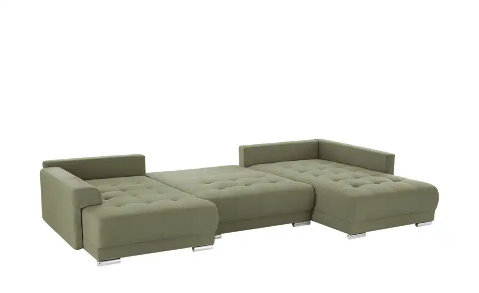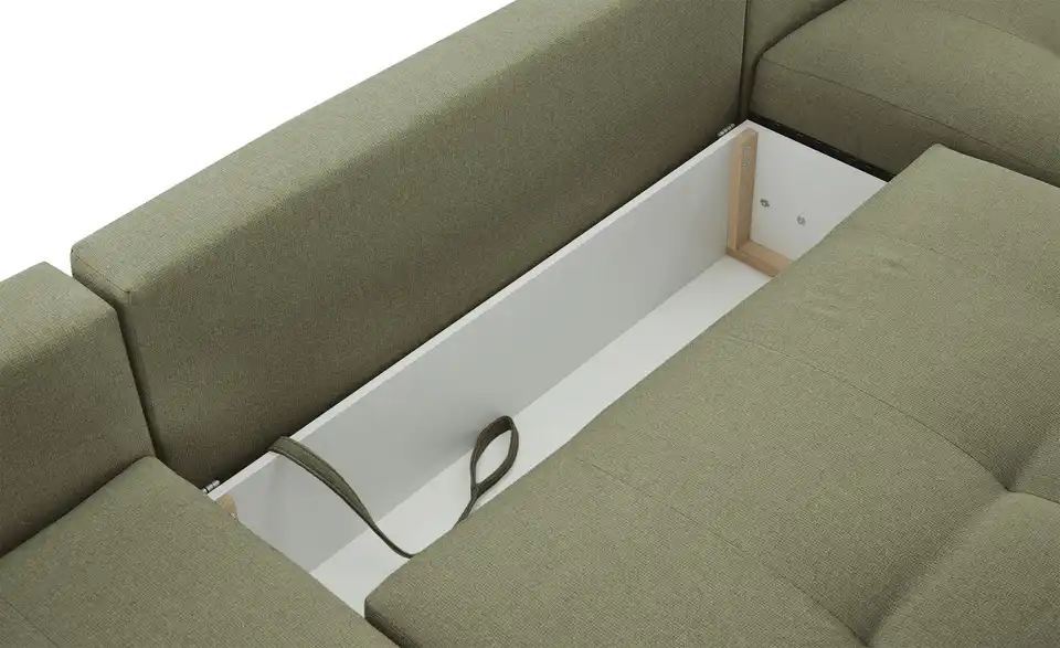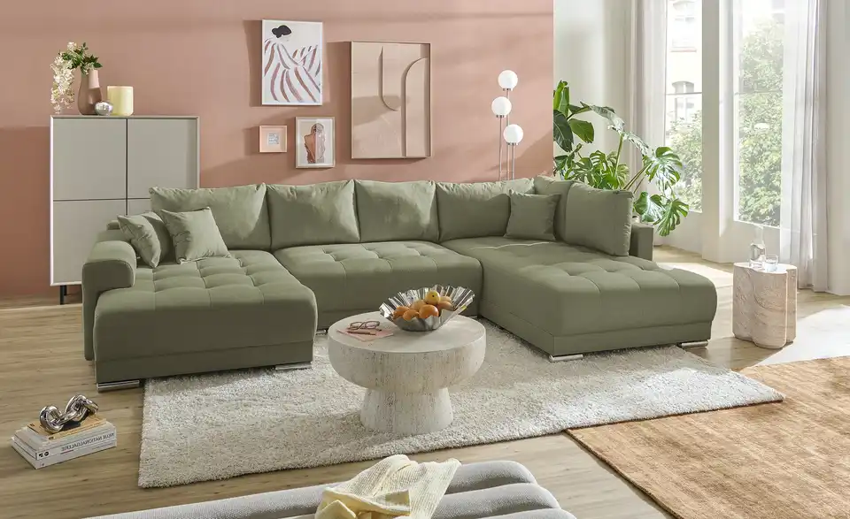 Richtig viel Platz für Freunde und Familie: Diese Wohnlandschaft überzeugt mit zwei einladenden Ottomanen und einer praktischen Schlaffunktion. Sitzen Sie zur Familienfeier bequem zusammen oder genießen Sie in großer Runde einen Filmeabend mit Freunden. Platz gibt es hier genug. Und wenn es doch etwas länger wird, können Sie mit nur wenigen Griffen den Mittelteil umklappen und zu einer Liegefläche umfunktionieren. Dann finden zwei Übernachtungsgäste problemlos Platz. Das dazugehörige Bettzeug lässt sich außerdem im geräumigen Bettkasten unter der Sitzfläche verstauen.Lieferung & Versand