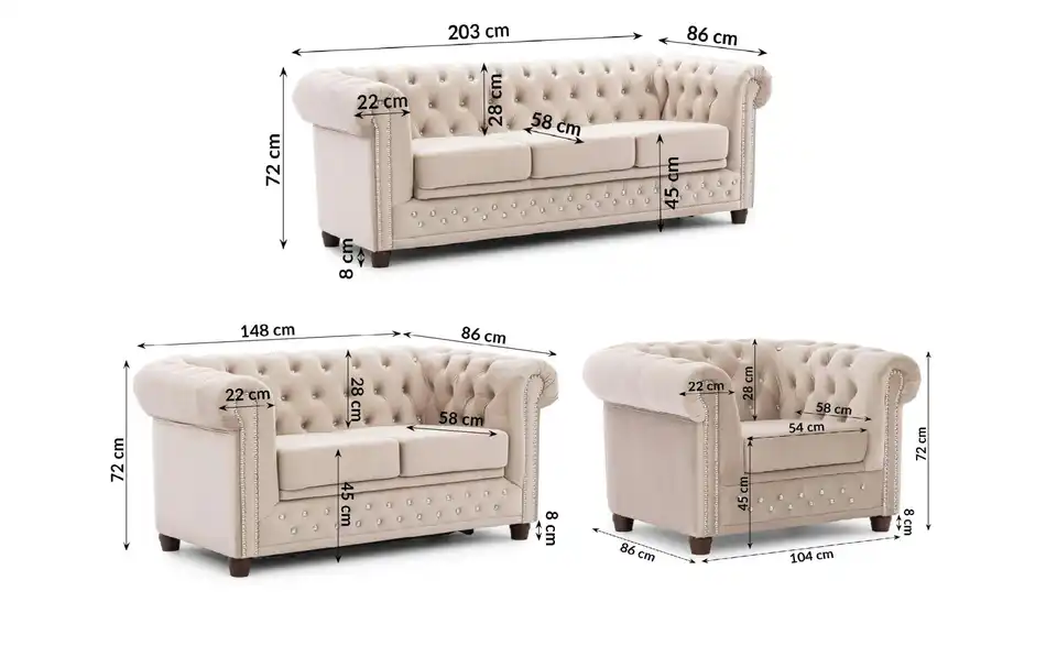 - Lieferumfang / mitgeliefertes Zubehör1 x 3-Sitzer Sofa, 1 x 2-Sitzer Sofa, Sessel