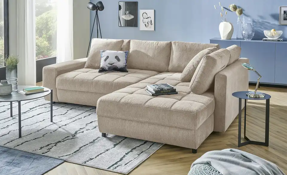 Dieses Ecksofa verbindet modernes Design mit durchdachter Funktionalität. Dank der integrierten Schlaffunktion entsteht im Handumdrehen eine großzügige Liegefläche. Der belüftete Bettkasten bietet praktischen Stauraum, während der mitgelieferte Hygiene-Topper für zusätzlichen Schlafkomfort sorgt. Der pflegeleichte Flachgewebe-Bezug lässt sich meist einfach mit Wasser reinigen und ist ideal für Familien und Haustierbesitzer, da er vor dem Ausfasern durch Tierkrallen schützt und über eine flammhemmende Schutzschicht verfügt. Machen Sie es sich bequem und genießen Sie entspannte Stunden auf dem Ecksofa Arissa de Luxe.Lieferung & Versand