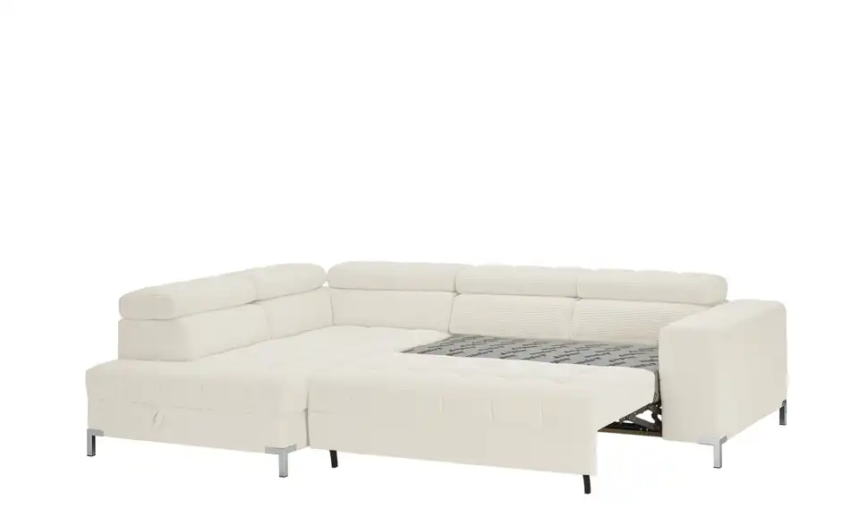 Dieses Ecksofa ist eine großartige Bereicherung für Ihre Einrichtung. Die Couch wird dank der Kopfteilverstellung zu einer absoluten Oase der Entspannung, lädt aufgrund des Federkerns sowie der Polsterung aus Schaumstoff zum Relaxen ein und ist frei im Raum platzierbar. Das Gestell ist aus Metall gefertigt. Die Couch weist einen Bettkasten, in dem die Gästebettwäsche verstaut werden kann, auf, nimmt 284 x 97 x 200 cm ein und lädt mit der geräumigen Sitztiefe von 62 cm zum Relaxen ein. Dieses Sofa garantiert jedem Zuhause außergewöhnliche Wohlfühlmomente.