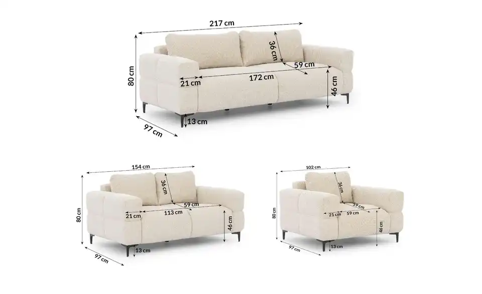 - Mehr zu MaßenSitzbreite - 3-Sitzer 172 cm; 2-Sitzer: 113 cm; Sessel 59 cm
