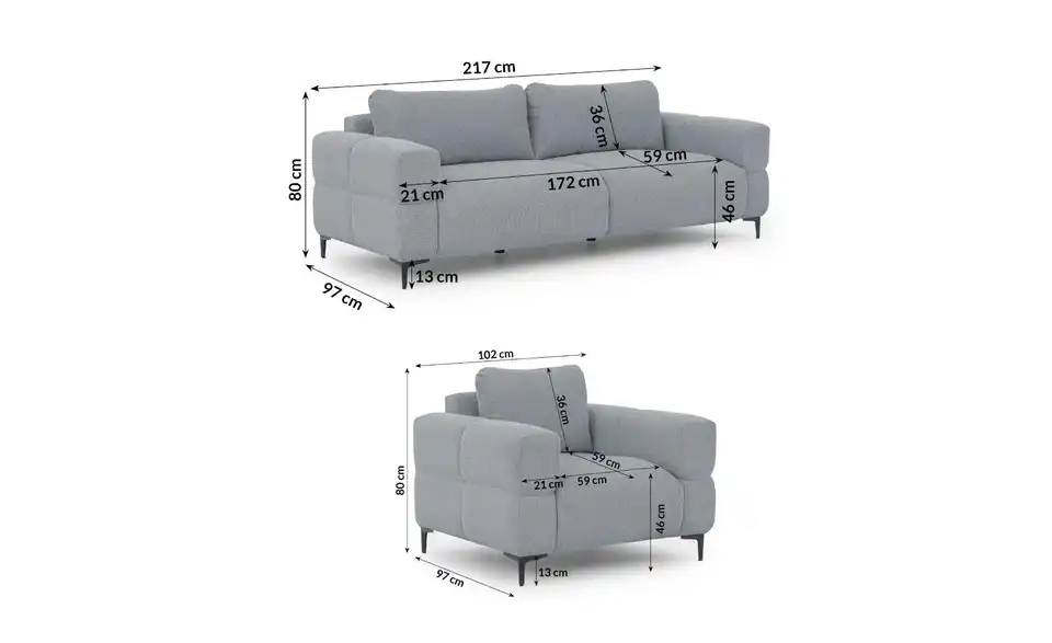 - Mehr zu MaßenSitzbreite - 3-Sitzer 172 cm; Sessel 59 cm
