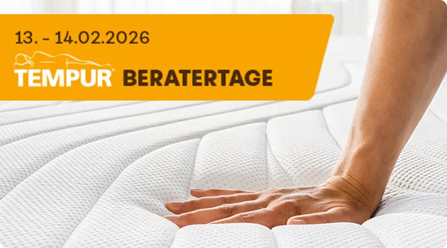 Lassen Sie sich während der Tempur Beratertage jeweils am 13. - 14.02. in der Matratzenabteilung umfangreich über die Vorteile einer Tempur-Matratze und Lattenrost beraten. Testen Sie beim Probeliegen den unvergleichbaren Liegekomfort.