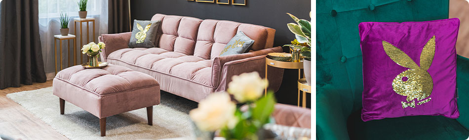 Den luxuriösen Stil der Playboy-Clubs aus den 60ern übertragen Sie mit der aktuellen Kollektion von Playboy Home ganz einfach in Ihr Wohnzimmer. Empfangen Sie Ihre Gäste in einem Lounge-Ambiente aus Samt und Gold. Die großzügigen Polstermöbel laden mit samtigen Bezugstoffen zum Verweilen ein. Dunkle Holzoptiken und goldene Details sorgen für einen Hauch von Luxus. Und wenn mal ein Gast über Nacht bleibt, überzeugt das Sofa Scarlett durch seine praktische Schlaffunktion.