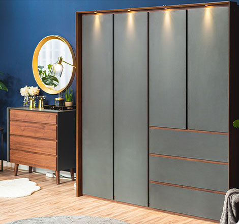 Oberflächen in Anthrazit und Walnuss-Dekor lassen eine gediegene Atmosphäre