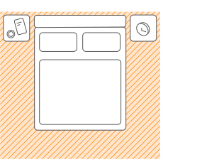 Eine ansprechende Stellvariante für kleine Schlafzimmer: Kopfteil und Nachtkommoden stehen frei und nur der untere Bett-Teil steht auf dem Teppich. Diese Anordnung lässt den Ruhebereich etwas luftiger wirken und Sie genießen trotzdem weichen Teppich neben dem Bett.