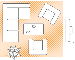 Platzieren Sie jeweils nur die Vorderbeine der Sitzmöbel auf dem Teppich, entsteht ebenfalls eine optische Einheit. Vorteil: Sie brauchen weniger Platz als für Variante 1. Aber Achtung: Nicht möglich bei Sitzmöbeln mit Kufen- oder Tellerfuß. Diesen fehlt dann der feste Stand.